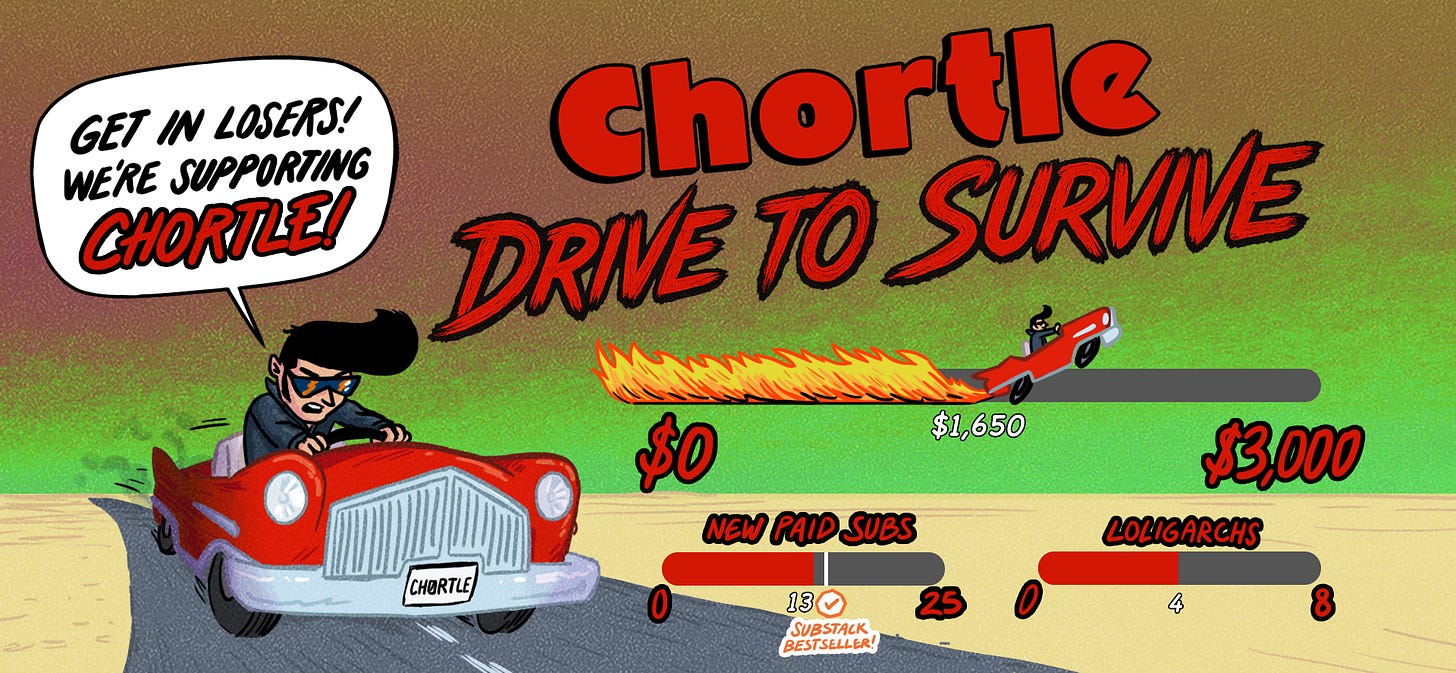 Thanks to some generous contributions, we’re more than halfway to our financial goal! Carol J. became a LOLigarch, while Neil W., Chelsey S., Brian N., and Joe S. became paid subscribers. Plus, David N. and Henry S. both gave gift subscriptions!