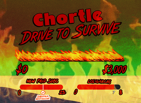 The Drive to Survive is officially complete—and officially a success! Enormous thanks to Andy R., who signed up overnight, as well as Alex B., Robin W., Martin H., and Eric F.—who all answered the call after I posted on social media that we needed one more paid subscriber to push us over the finish line. HEROES, each and every one of you.